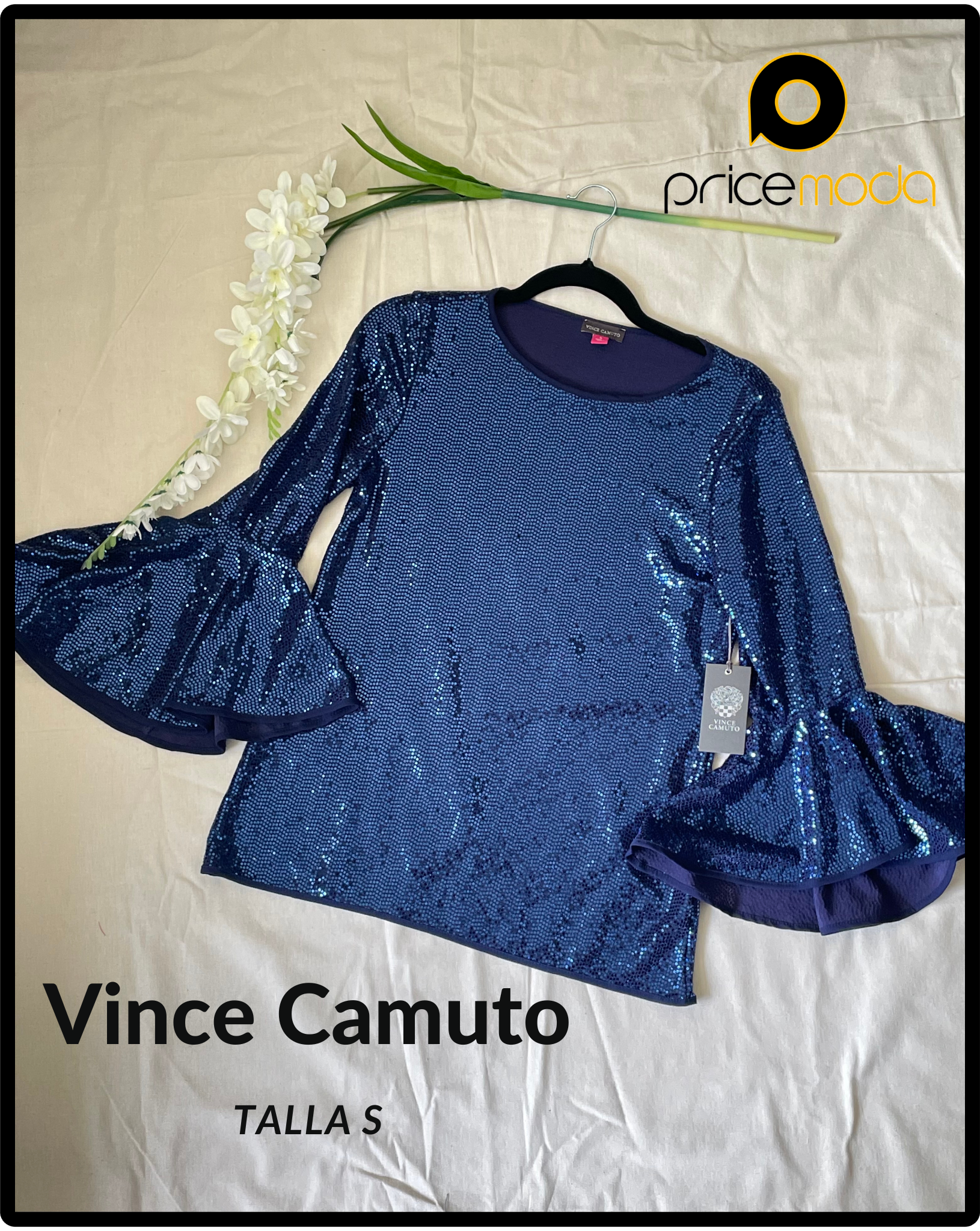 Blusa manga 3/4 para fiesta, mangas holgadas, color: azul marino con lentejuela ,Talla: L , Marca : VINCE CAMUTO
